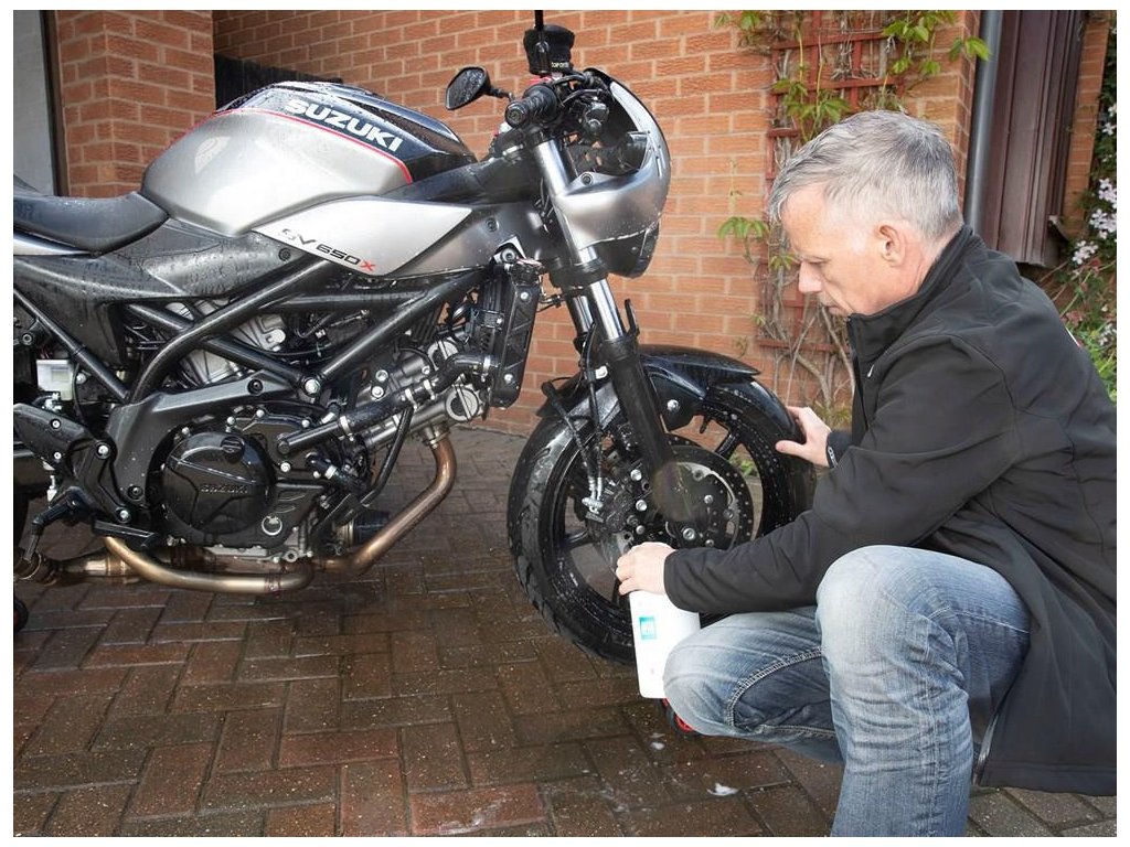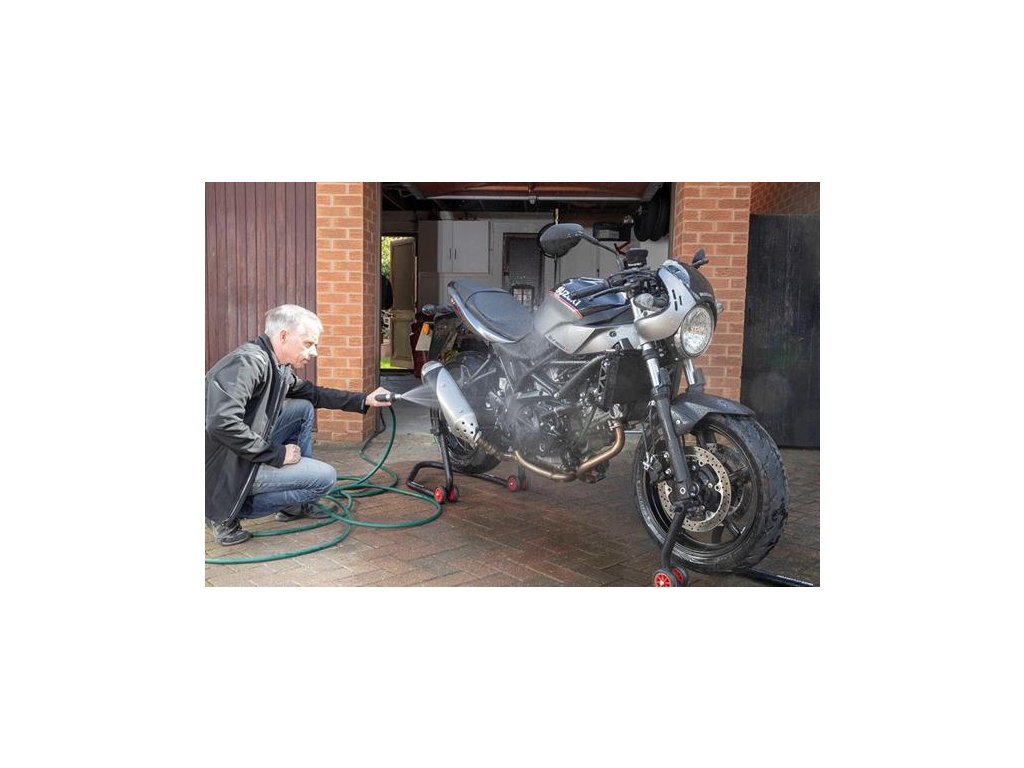 2. Opláchnite motocykel so studenou vodou a naneste Motorcycle Cleaner v dostatočnom množstve vždy na jednu časť.